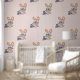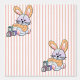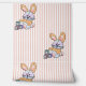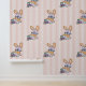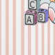 Este papel de pared presenta un disquete, relleno, conejo de calico jugando con un conjunto de bloques de fieltro con un fondo rayado rosado. Coordina con todos los diseños y productos de la serie "Arte de guardería con placas azules" de HoMeArts.