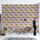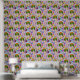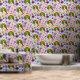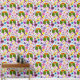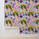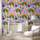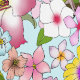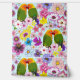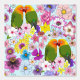 Dos Aves de Amor juntas en una rama de árbol con flores rosadas, blancas, amarillas y violetas alrededor de ellos en un fondo azul