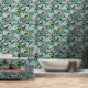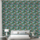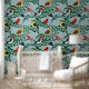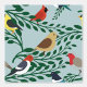 Numerosos tipos de pájaros en ramas; robles, cardenales, pájaros carpinteros, aletas doradas, gorriones y magpies sobre un fondo verde azulado.