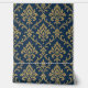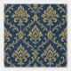 Un elegante estampado floral de estilo barroco sin fisuras con motivos dorados ornamentados dispuestos simétricamente sobre un fondo azul oscuro texturado que crea un lujoso efecto de tapicería clásico