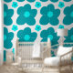 Big retro blue flowers pattern wallpaper. Teal and aqua blue colors on a white background.