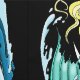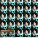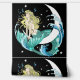 Una sirena de pelo rubio en una luna creciente con cola de color verde azulado con agua, burbujas de agua y estrellas alrededor de ella. Todas están decoradas en un estilo art decó.