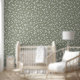 Boho green with white floral seamless pattern wallpaper; great addition to any infant, child's bedroom or other.