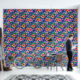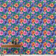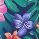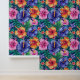 A bold, maximalist tropical floral print with big purple, orange, and pink blooms on a dark blue background,