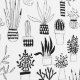 Cactus negros, dibujos de plantas suculentas y domésticas y garabatos sobre un fondo blanco. Arte original de Nic Squirrell.