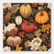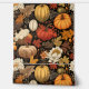 Un ilustracion rico y vibrante que exhibe una variedad de calabazas de diferentes formas y colores, rodeadas de hojas de otoño, bayas y flores de temporada. Los tonos cálidos de naranja, amarillo y marrón contrastan con el fondo oscuro, evocando la esencia de la caída. Esta compleja composición le da vida a la abundancia de la temporada de cosecha.