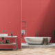 A textured red background with subtle vertical and horizontal lines, resembling a woven fabric. The pattern adds depth and a warm, inviting tone.