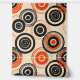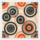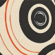 Esta obra de arte presenta un sorprendente patrón de círculos concéntricos de diferentes tamaños, dispuestos a través de un fondo de crema neutro. El diseño incorpora audaces tonos negros y vibrantes naranjas, creando un fuerte contraste visual que inmediatamente capta la atención. Los círculos están en capas e interconectados, con algunas líneas dibujadas a mano, lo que añade un aire dinámico y ligeramente irregular a la composición. La repetición de formas circulares y el esquema de color retro evocan un sentido de diseño moderno de mediados de siglo, dando a la pieza una calidad atemporal y lúdica.