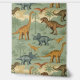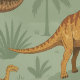 Step back into the Mesozoic Era with this stunning dinosaur wallpaper. This sophisticated pattern features detailed, vintage-style illustrations of favorite dinosaurs, including the mighty T-Rex, Brachiosaurus, the fierce Velociraptor, and the sturdy Triceratops. They roam a stylized prehistoric valley floor set against a backdrop of soft green mountains, ancient palms, and a cloudy, ochre sky. The muted, natural color palette of dusty greens, browns, and blues gives this design an appealing, timeless look, making it an excellent choice for a boy's bedroom, a themed playroom, or a bold feature wall. Search ID1237 to see products with this fun pattern. Note: design adapted from generative content.