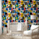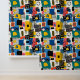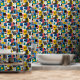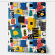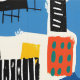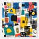 Esta obra de arte presenta una composición dinámica y ecléctica de formas, patrones y texturas abstractas, en capas juntas en forma de collage. El diseño incorpora colores llamativos como el azul, el amarillo, el rojo y el negro, y cada elemento varía en tamaño y forma. Las líneas dibujadas a mano, las rejillas y las pinceladas le dan un toque lúdico y espontáneo a la pieza, mientras que el arreglo irregular de las formas crea un sentido de movimiento y energía. La combinación de formas geométricas y marcas a mano alzada le confiere a la obra un ambiente artístico y moderno.
