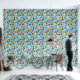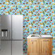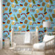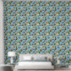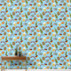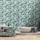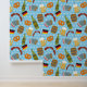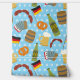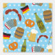 Papel de pared con temática Oktoberfest para la cocina o la novedad. Cuenta con bandera alemana, cerveza, pretzels y salchichas sobre un fondo azul de polka dot.