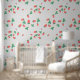Un dulce y lindo papel pintado que presenta un patrón encantador y juguetón de pequeñas fresas dispersas sobre un fondo gris claro y dulce. Las fresas están representadas en un rojo vibrante con hojas verdes, y están intercaladas con pequeñas y delicadas flores de fresa blancas o amarillas claras, lo que añade encanto. La impresión general es alegre, fresca y dulce, lo que la hace ideal para decorar guarderías y habitaciones de bebés, niños pequeños y niños.