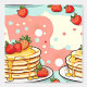 Un ilustracion ai de crepes de collage, fresas en tonos rosas, azules y blanquecinos con un ambiente de comedor de mediados de siglo.