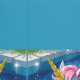 Un lindo chica joven se desliza suavemente sobre una carroza rosa y blanca de unicornio, deslizándose por una piscina azul y cristalina.