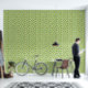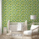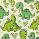 Patrón alegre y colorido lleno de adorables dinosaurios personalizados y pequeños pájaros. Los dinosaurios son de varios tonos verdes, mostrando diferentes tipos de expresiones adorables, como posturas sonrientes y juguetonas. Algunos personajes de dinosaurios son representados de pie, mientras que otros están sentados o en movimiento. Además, hay animados pájaros amarillos repartidos por todo el hotel, lo que crea un ambiente animado y alegre. El fondo es de un suave color pastel que realza el ambiente alegre y agradable de la composición general.