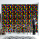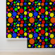 Diseño geométrico abstracto colorido, burbujas azules, rojas, amarillas, verdes y rosas sobre fondo negro