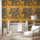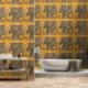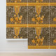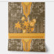 El diseño parece ser un diseño textil o de papel pintado con una estética tradicional e intrincada. Aquí hay una descripción detallada: ・ Sección superior: Presenta una forma adornada y alargada de lágrima en amarillo sobre un fondo marrón con una textura angustiada. ・ Sección central: Muestra un motivo floral con grandes flores amarillas y hojas, colocadas sobre el mismo fondo de textura marrón. ・ Sección inferior: Muestra un borde decorativo compuesto de formas geométricas repetidas y pequeños motivos de lágrimas en amarillo sobre marrón. El diseño general parece inspirarse en el arte del sur de Asia, dándole un ambiente rico y cultural.