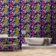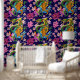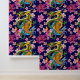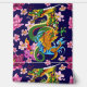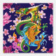 Un dragón chino verde con un pez koi naranja con flores de loto y flores de cerezo en el fondo de azul oscuro