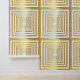 Papel pintado de color blanco y dorado, elegante y glamuroso, con grandes cuadrados dorados brillantes, intrincadamente ligados para producir un efecto 3D cautivador.