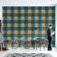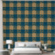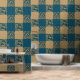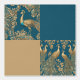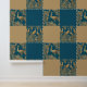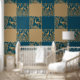 Este elegante papel pintado presenta un patrón de grandes cuadrados, con detallados diseños de pavo real en oro azul y falso, intercalados con cuadrados llanos de azul y oro. El patrón general tiene un aspecto muy claro, mientras que los detalles complejos proporcionan profundidad e interés.