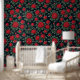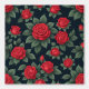 Un patrón floral sin fisuras con rosas rojas vibrantes en plena floración, rodeado de hojas verdes. Con un fondo negro profundo, el sorprendente contraste realza la elegancia y el romanticismo del diseño, haciéndolo perfecto para tejidos, papel pintado o huellas decorativas.