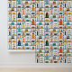 Estantes de cocina retro modernos, elegantes, minimalistas y gráficos de mediados de siglo, con tazas, cafetera, latas de café y té, platos de horneado, sartenes y pasteles. Hazme saber si te gustaría una escala diferente para el patrón. Me encantaría ver mi diseño en el mundo - etiquetarme en IG @parry_vegan.