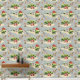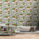 Farm themed pattern wallpaper for a child's room. Farmhouse, red barn, trees, and animals make up the fun pattern that repeats in a large print. The background color is gray-blue but the pattern will delight all children. Decorate one wall or all.