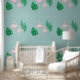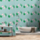 Este fondo de pantalla personalizado presenta un diseño de flamingo rosa tropical con un fondo polvoriento de color verde azulado. Una imagen de dos flamencos rosas y hojas de palma verde vibrante está recubierta de baldosas en el fondo de la pared. La imagen tiene un diseño de Relieve metalizado que le da un aspecto metálico.