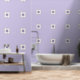 En este fondo de pantalla se repite un diseño de arte fractal en morado y oro. El diseño tiene un aspecto floral. El fondo es lavanda. También hay accesorios de baño a juego.