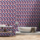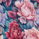 Este fondo de pantalla contiene rosas y peonías en azul cielo suave, con una cáscara delicada rosa y un vino tinto oscuro, con follaje verde azulado y morado en el fondo. Hermoso y lujoso con un estilo de campo vintage que sigue siendo muy moderno.