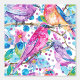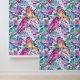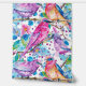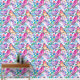Un patrón impecable de acuarela con pájaros coloridos sentados en un árbol adornado con flores rosas y azules, colocado sobre un fondo blanco. El diseño captura la belleza de la naturaleza con un toque artístico, combinando colores vivos y detalles delicados.