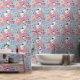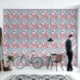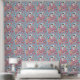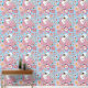 Un cisne blanco rodeado de flores rosas en un fondo azul