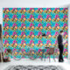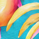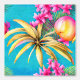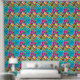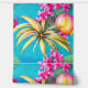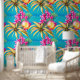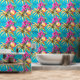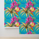 Ideal para cualquier establecimiento de playa, restaurante costero, hotel, lodge, resort y chalet, este patrón de repetición sin fisuras con hojas tropicales sobre las cuales aparecen flores rosadas y un fruto de la isla redonda con un vibrante fondo azul turquesa. Trae la playa en el interior, con este elegante y moderno mural de estilo hawaiano de fácil pelado y palo que es ideal para paredes lisas y texturadas.