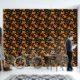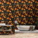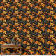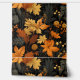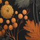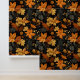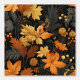 Un llamativo diseño con temática otoñal, con hojas audaces y ricas de color amarillo dorado y naranja quemado, ambientado con un fondo negro profundo. Los detalles intrincados de las hojas, junto con la sutil inclusión de bayas y helechos, crean una sensación de calor y textura. El follaje gris y verde oscuro silencioso añade profundidad, haciendo destacarse los colores de otoño vibrantes, encapsulando la esencia de la temporada de otoño con elegancia.