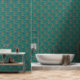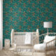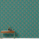 A whimsical pattern featuring leaping brown rabbits surrounded by yellow, pink, and red flowers, green leaves, and dotted accents on a teal background.