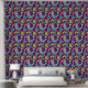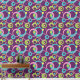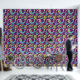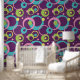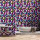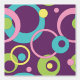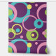 Un fondo violento morado está adornado con un patrón divertido de círculos, puntos y anillos de colores vivos, como el rosa, el verde, el azul y el amarillo.