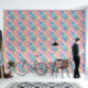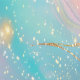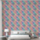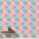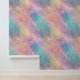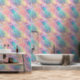 El papel pintado en esta pared combina los tonos pastel con el turquesa rosa, el naranja y el amarillo, con acentos dorados celestiales.