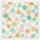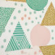 This delightful and playful seamless pattern features an energetic arrangement of geometric shapes, including triangles, circles, and semicircles. The design is rendered in a soft, modern pastel palette of mint green and blush pink, complemented by pops of shimmering gold and textured patterns.