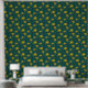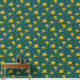 Wallpaper with flowering St. John's Wort pattern. Big yellow flowers, with buds, leaves and stems, are printed in a seamless, repeating pattern over a very dark teal blue color.