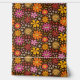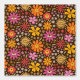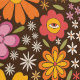 Este es un lindo patrón hippie psicodélico de flores de los años 70 con ojos surrealistas en naranja, rojo, rosa con pequeñas hojas verdes sobre fondo oscuro.