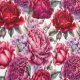 Las rosas rojas, las peonías borgoñas y las flores de lila lavanda se combinan para hacer un hermoso, dulce y romántico patrón de papel tapiz de impresión grande.