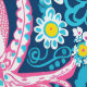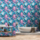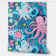 Un patrón sin fisuras, dibujado a mano, con pulpos rosados y blancos rodeados de flores blancas, azules y amarillas, colocado contra el fondo azul profundo del océano. El diseño combina magníficas criaturas marinas con vibrantes elementos florales, creando un ambiente submarino encantador y animado.