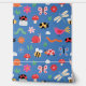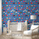 Bright and cheerful kids’ wallpaper featuring cute bugs, bees, ladybirds, flowers and butterflies on a bold blue background — perfect for nursery or playroom walls.