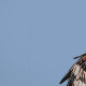 Una elegante cometa roja en vuelo sobre un fondo azul claro. Puede cambiar el color de fondo. La cometa roja (Milvus milvus) se salvó de la extinción nacional en el Reino Unido y se ha reintroducido en Inglaterra y Escocia.