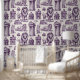 Este lujoso papel pintado en la pared presenta un conjunto de leones y estatuas de color rosa morado