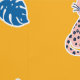 Pequeños y alegres leopardos coloridos adornados con hojas de selva sobre fondo amarillo mostaza. El leopardo es azul kobalt, azul claro, rosa, verde azulado y mostaza.