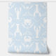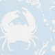 White lobsters, crabs, and seashells form a coastal damask on pale blue. Ideal for breezy coastal, nautical, or cottage style.