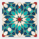 Mosaico marroquí de mármol azul marino, verde azulado, blanco y rojo con un falso borde dorado.