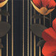 Experimente el audaz drama Art Deco con este patrón único. Una forma geométrica central de oro irradia hacia arriba y hacia afuera, ramificándose en tres secciones distintas, cada una con flores rojas y oro Art Deco vibrantes. Una flor rojiza y dorada llamativa se encuentra también en el corazón de este motivo radiante central, con elementos florales similares que adornan ambas esquinas del fondo. Las líneas doradas rectas se elevan a la parte superior, mejorando la estructura dinámica frente a una sofisticada mezcla de negro y gris en el fondo. Este diseño es una mezcla cautivadora de inspiración natural y geometría Art Deco icónica, perfecta para hacer una declaración glamurosa.