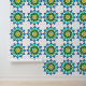 La imagen de Mandala está cubierta de azulejos en papel. La mandala única tiene forma de anillo exterior de diamante en dos tonos azules. El siguiente anillo hacia el centro es el de los óvalo de verde con puntos rojos. En el centro está el círculo amarillo.